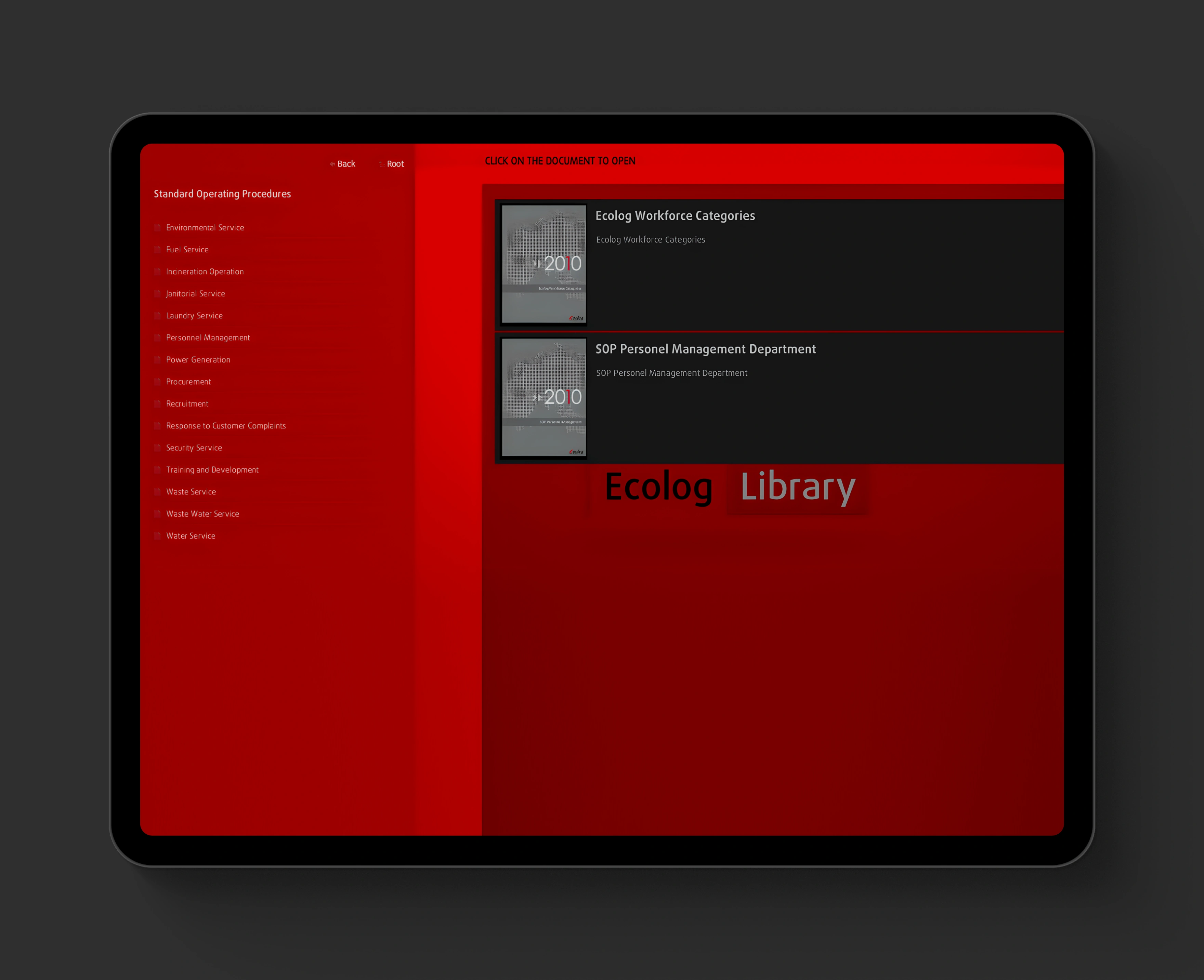 The “Ecolog Library” was developed as a dedicated touchscreen application, designed to transform how users access critical documents. My role as Designer was central to creating a user-friendly and intuitive interface for this digital repository.