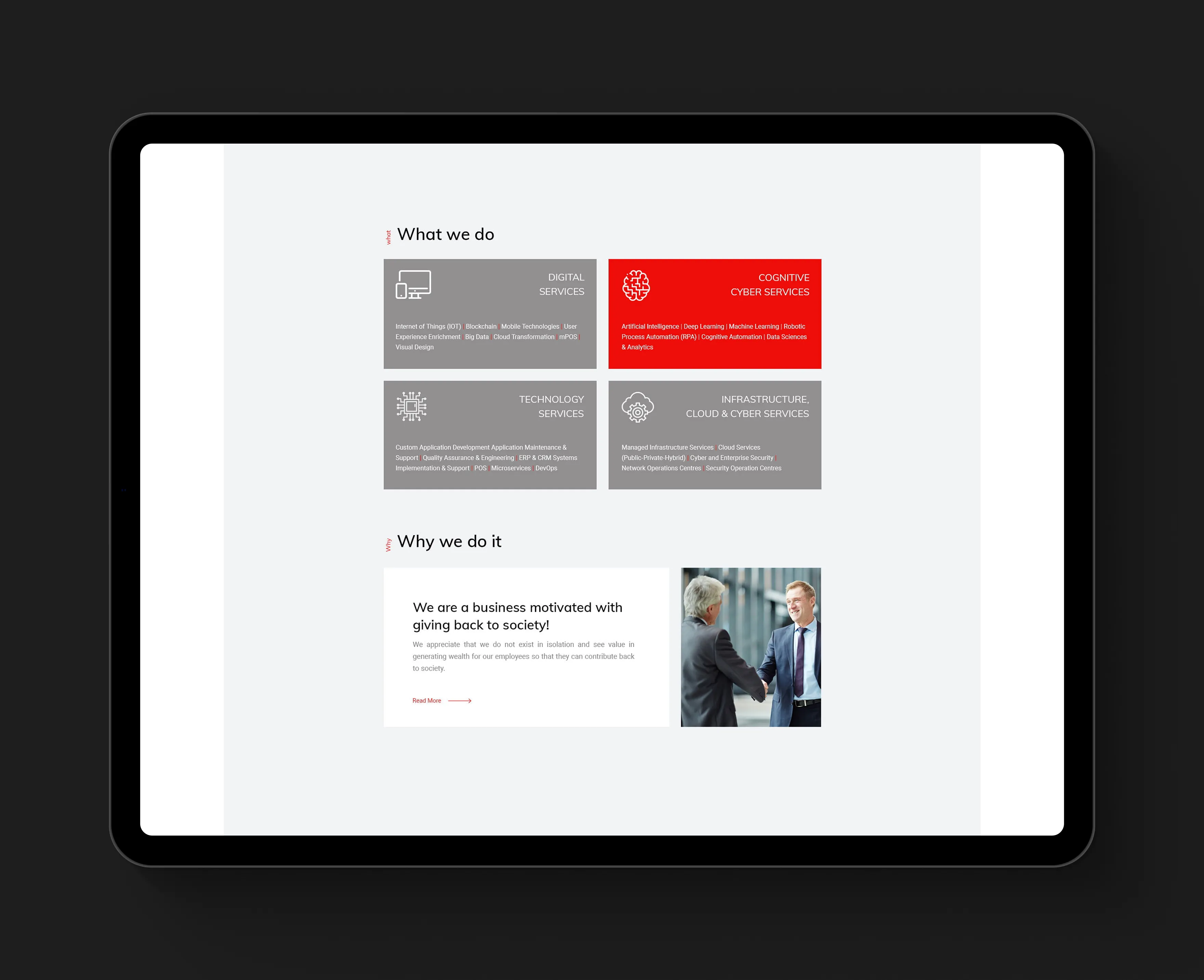 Service Architecture: Clear grouping of Digital Services, Cyber Services, Technology Services, and Infrastructure.