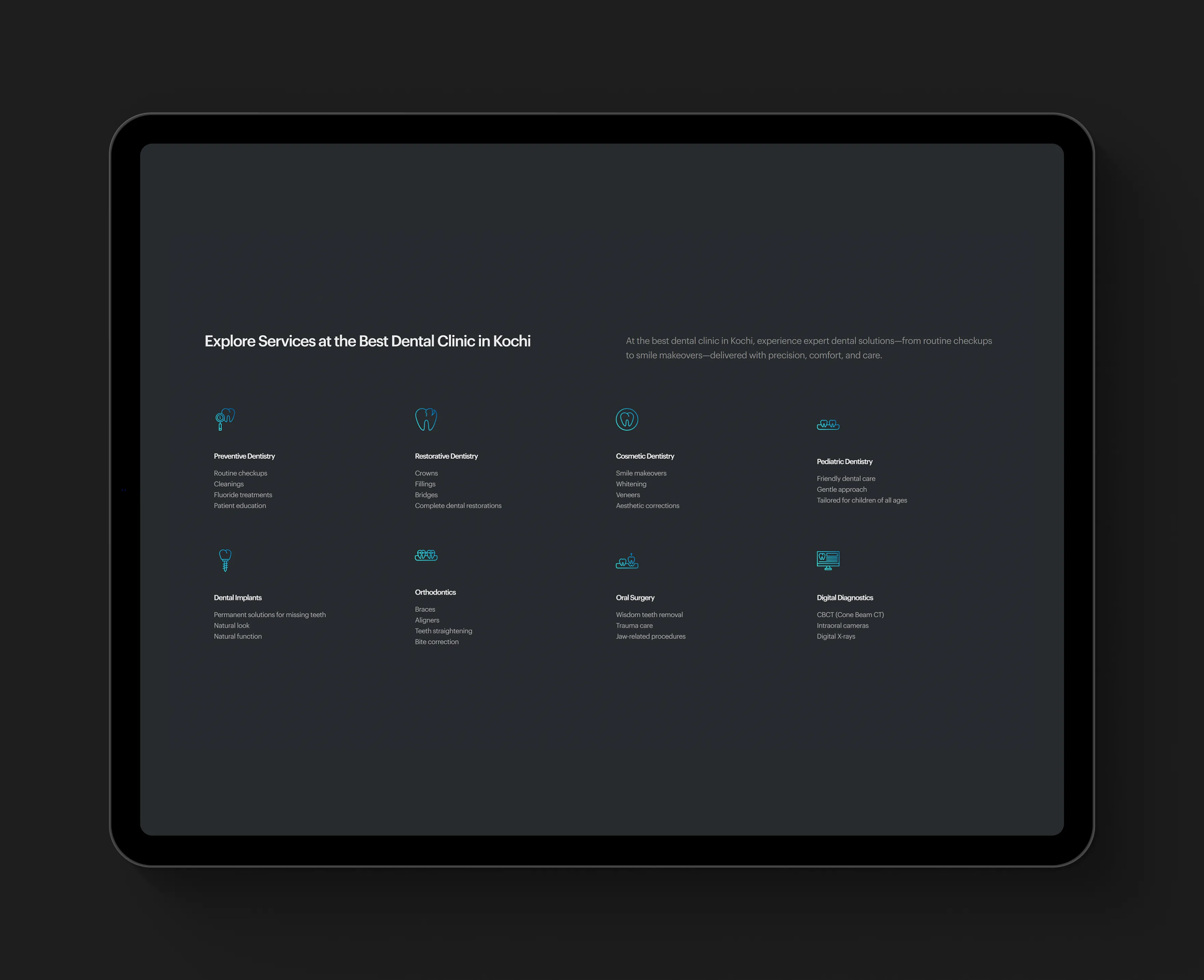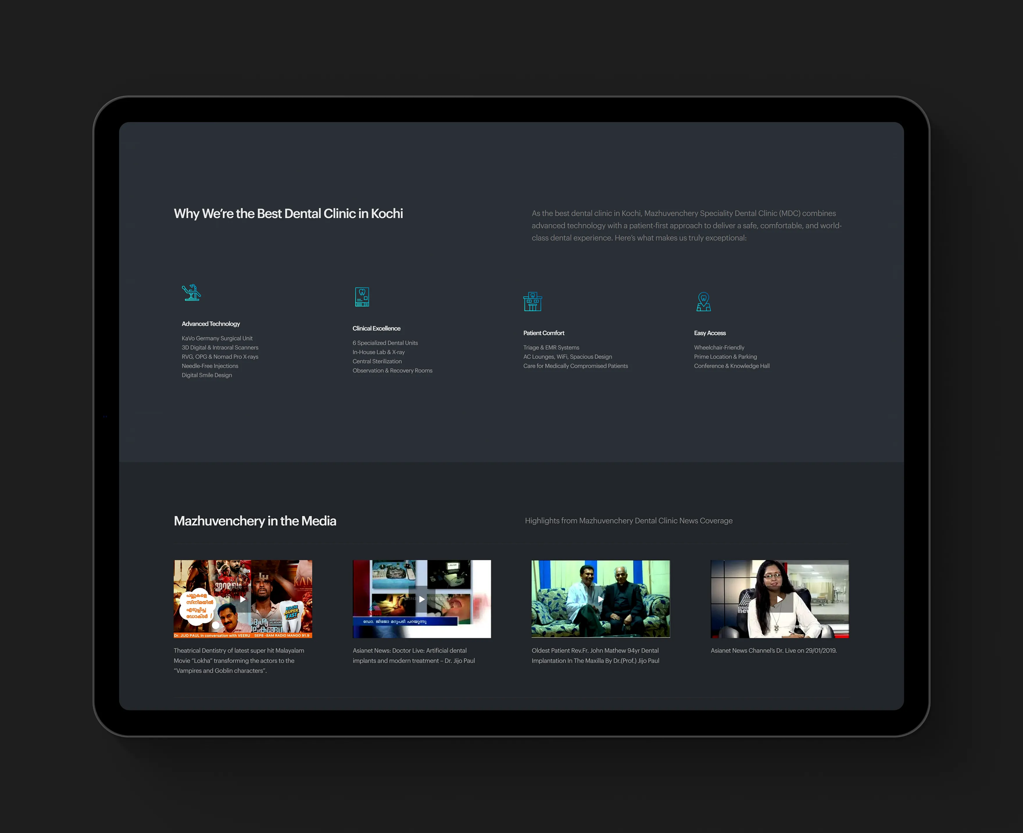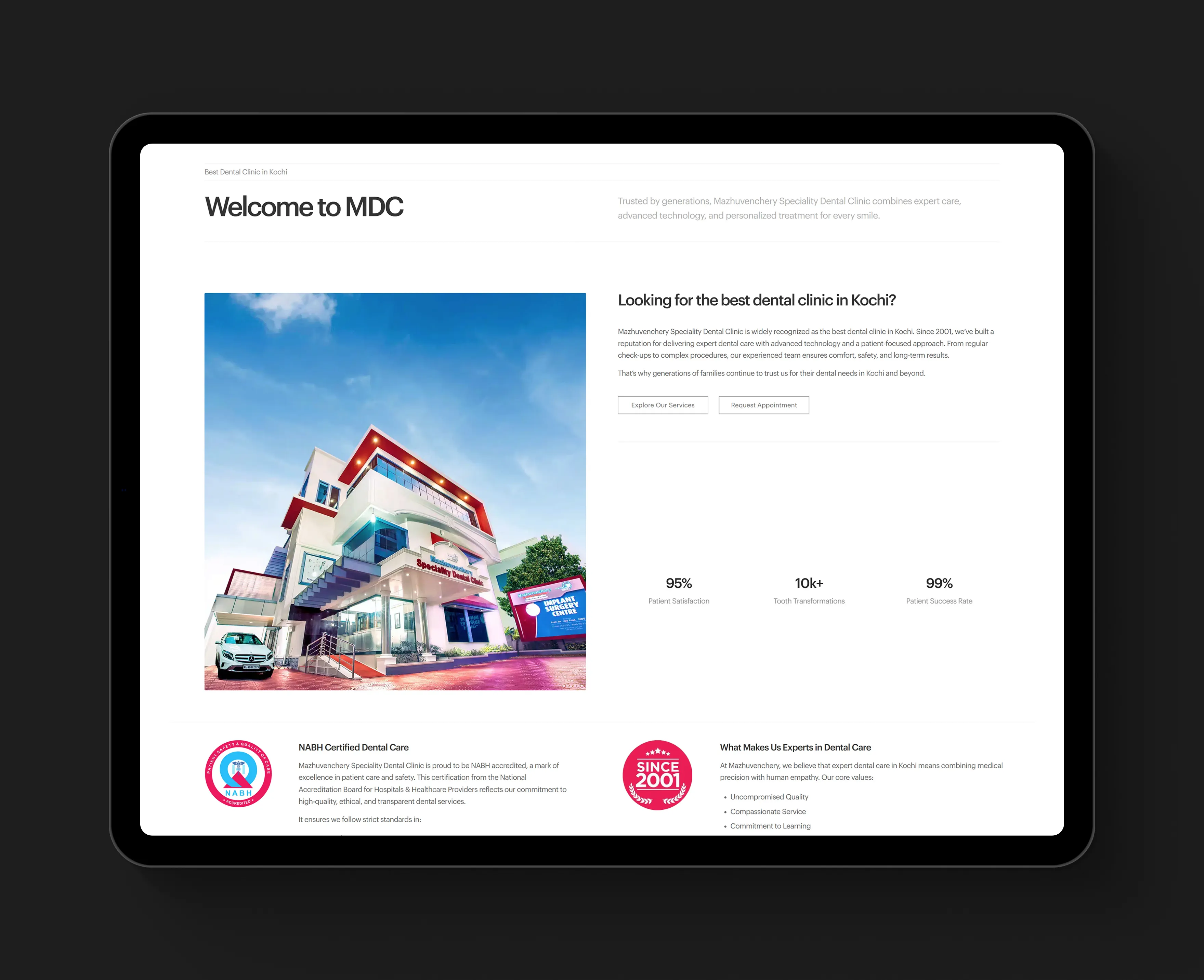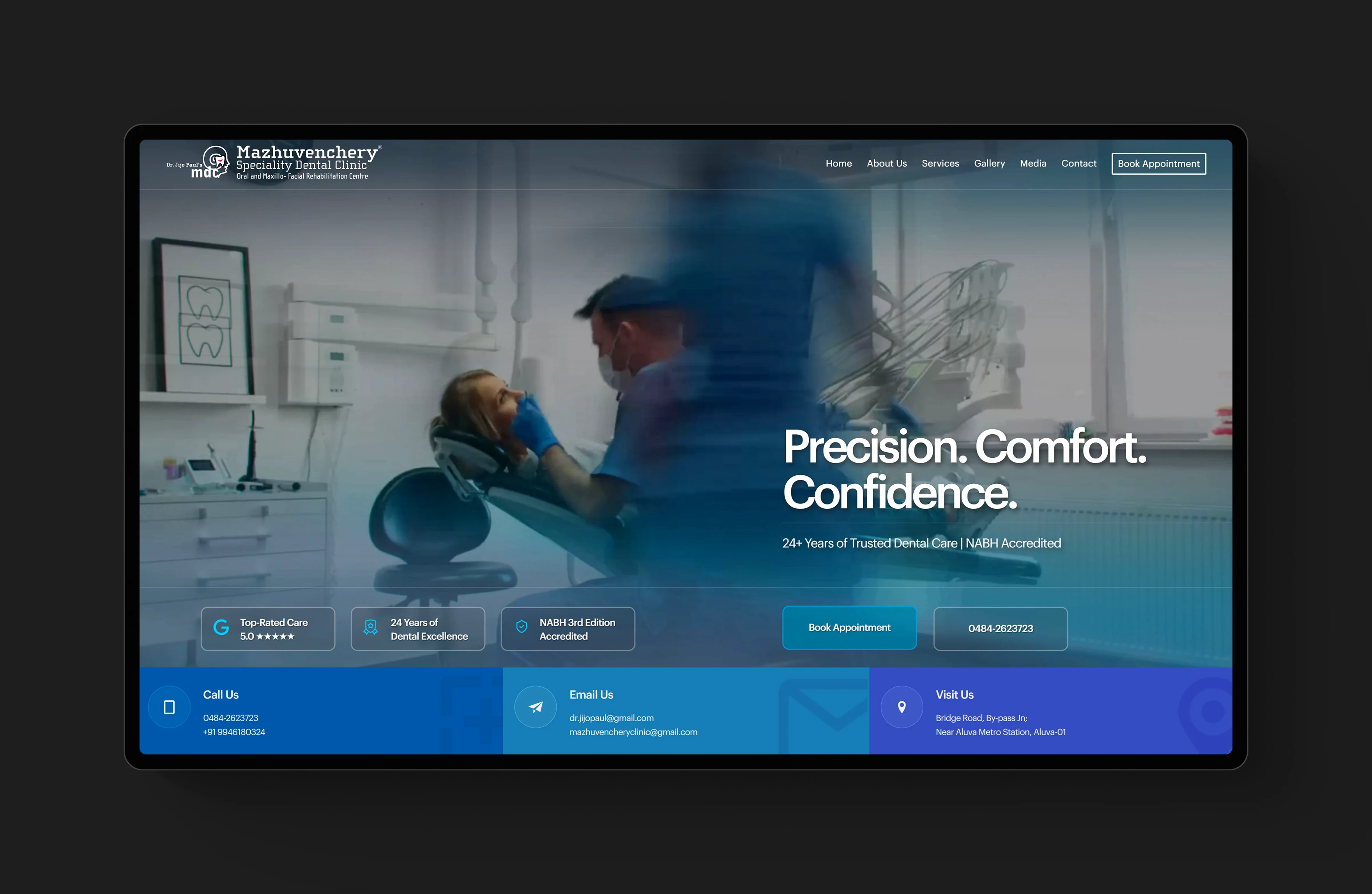 Mazhuvenchery Speciality Dental Clinic is a trusted NABH-accredited dental and maxillofacial centre with 24+ years of service in Kochi. The goal of this project was to modernize their online presence with a clean, patient-centric website that communicates trust, showcases services, and simplifies appointment booking.